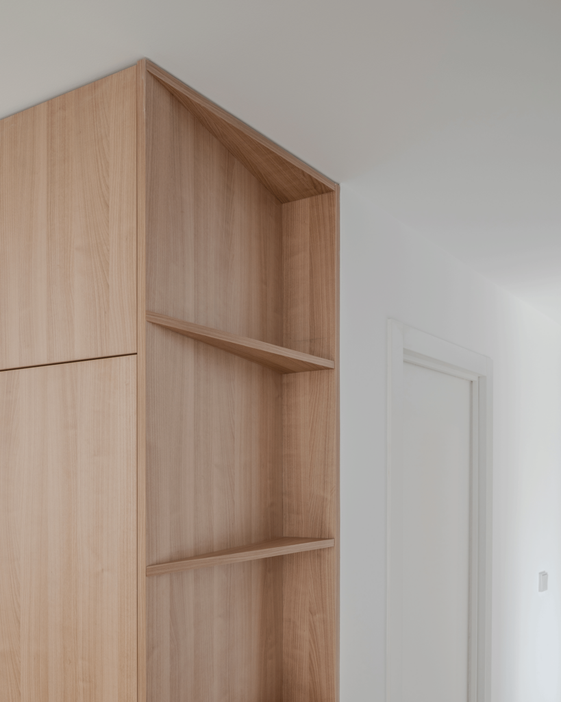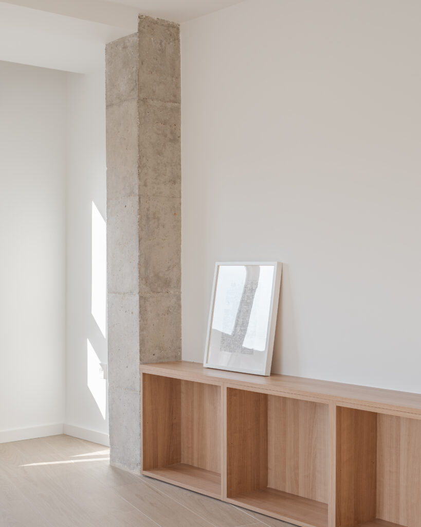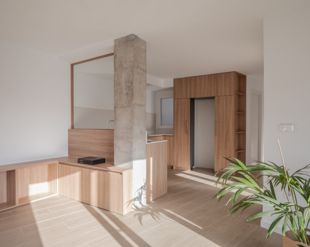 En la materialidad se ha optado por la madera como protagonista en el proyecto, generando esta misma la unión entre la cocina y el salón mediante un mueble a medida continuo. Así mismo se dejan algunos pilares y vigas de hormigón vistos que ofrecen contrapunto crudo a la paleta cálida de colores.