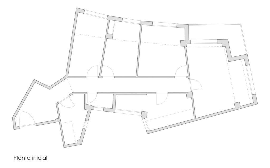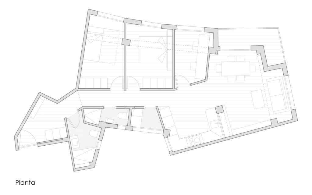 Respetando la ubicación de todas las estancias y el número de estas, se busca realizar intervenciones puntuales en la distribución;  como abrir la cocina al comedor-salón acortanado el largo pasillo en el proceso y unificando el espacio de día, lo que proporcionará la  luz natural en todas las estancias y una sensación de mucha más amplitud.