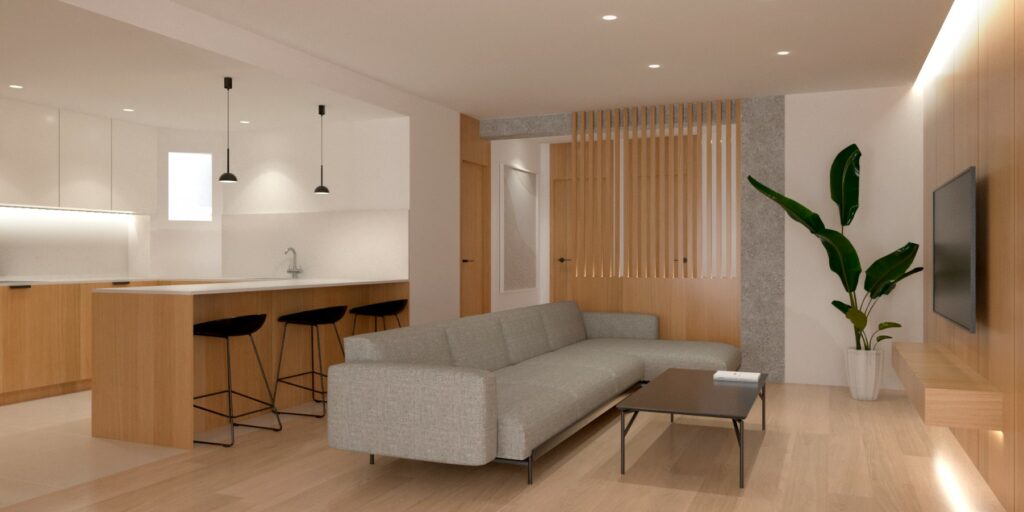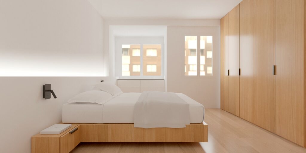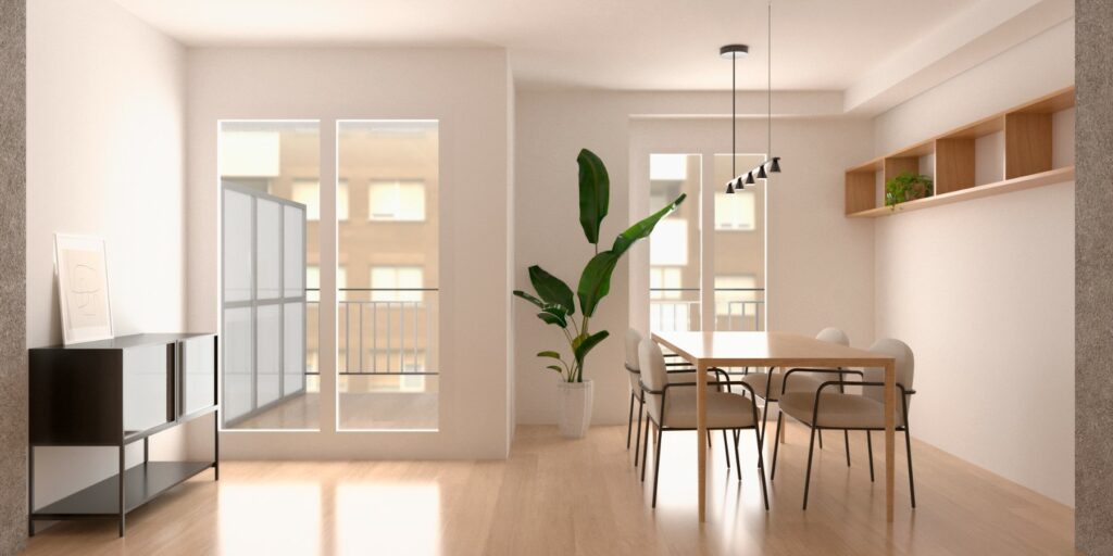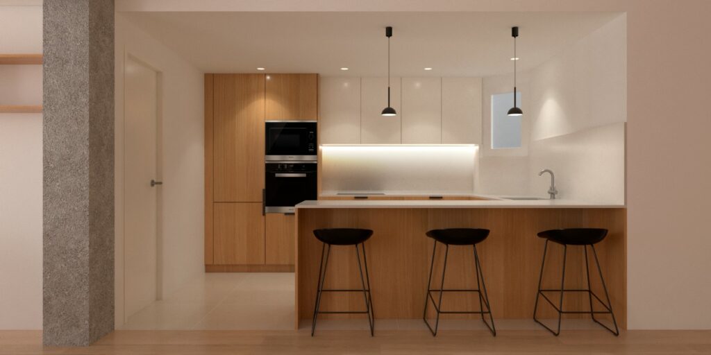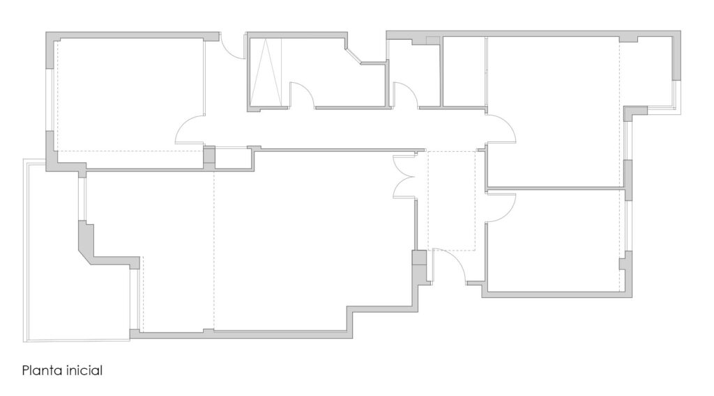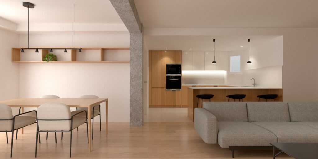Respetando la ubicación de todas las estancias y el número de estas, se busca realizar intervenciones puntuales en la distribución; como abrir la cocina al comedor-salón acortanado el largo pasillo en el proceso y unificando el espacio de día, lo que proporcionará la luz natural en todas las estancias y una sensación de mucha más amplitud.