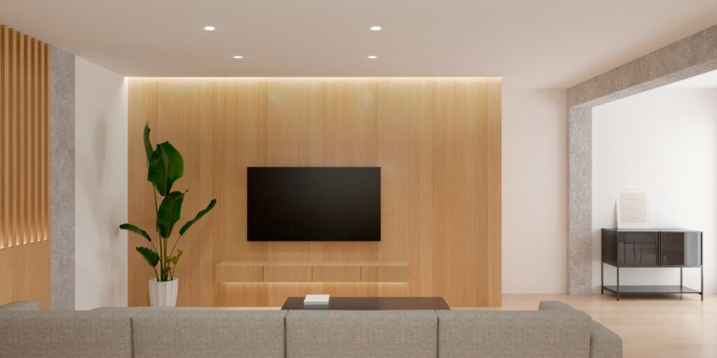 En la materialidad se ha optado por la madera como protagonista en el proyecto, generando esta misma la unión entre la cocina y el salón mediante un mueble a medida continuo. Así mismo se dejan algunos pilares y vigas de hormigón vistos que ofrecen contrapunto crudo a la paleta cálida de colores.