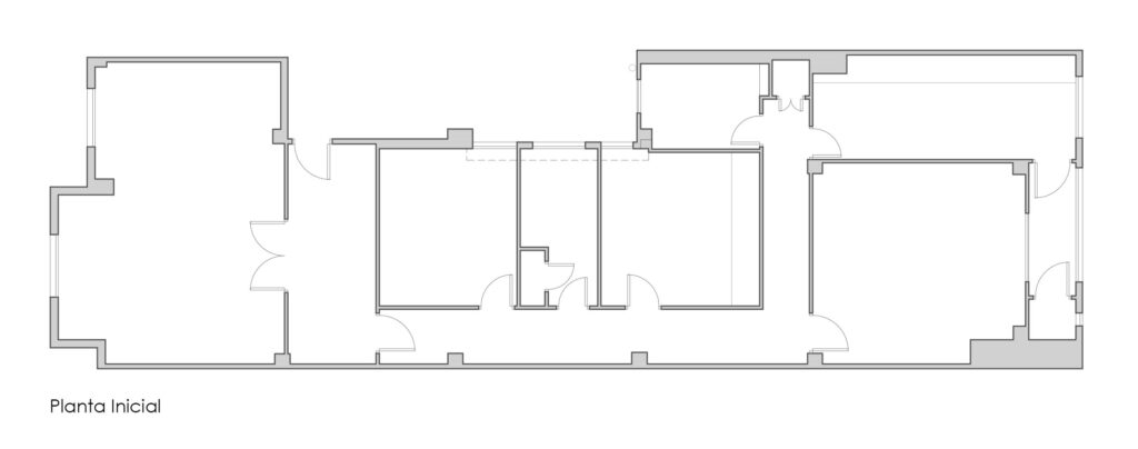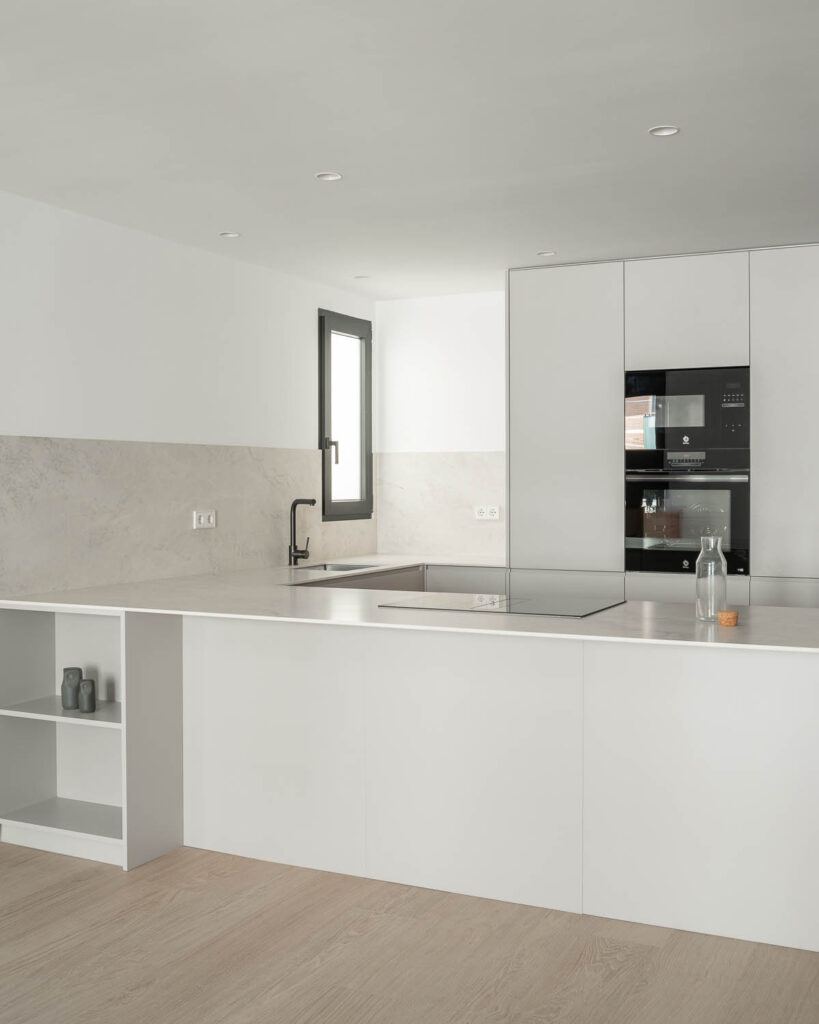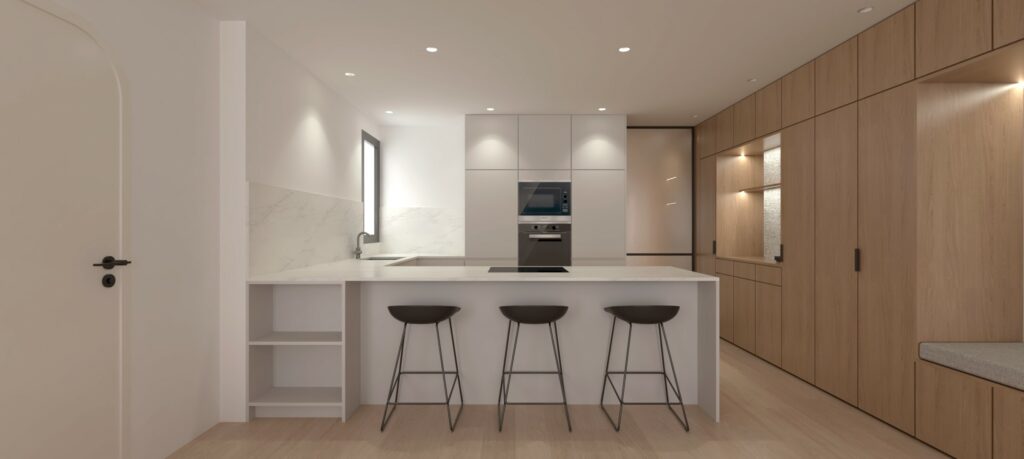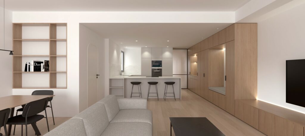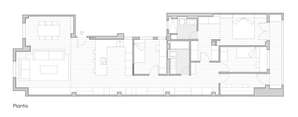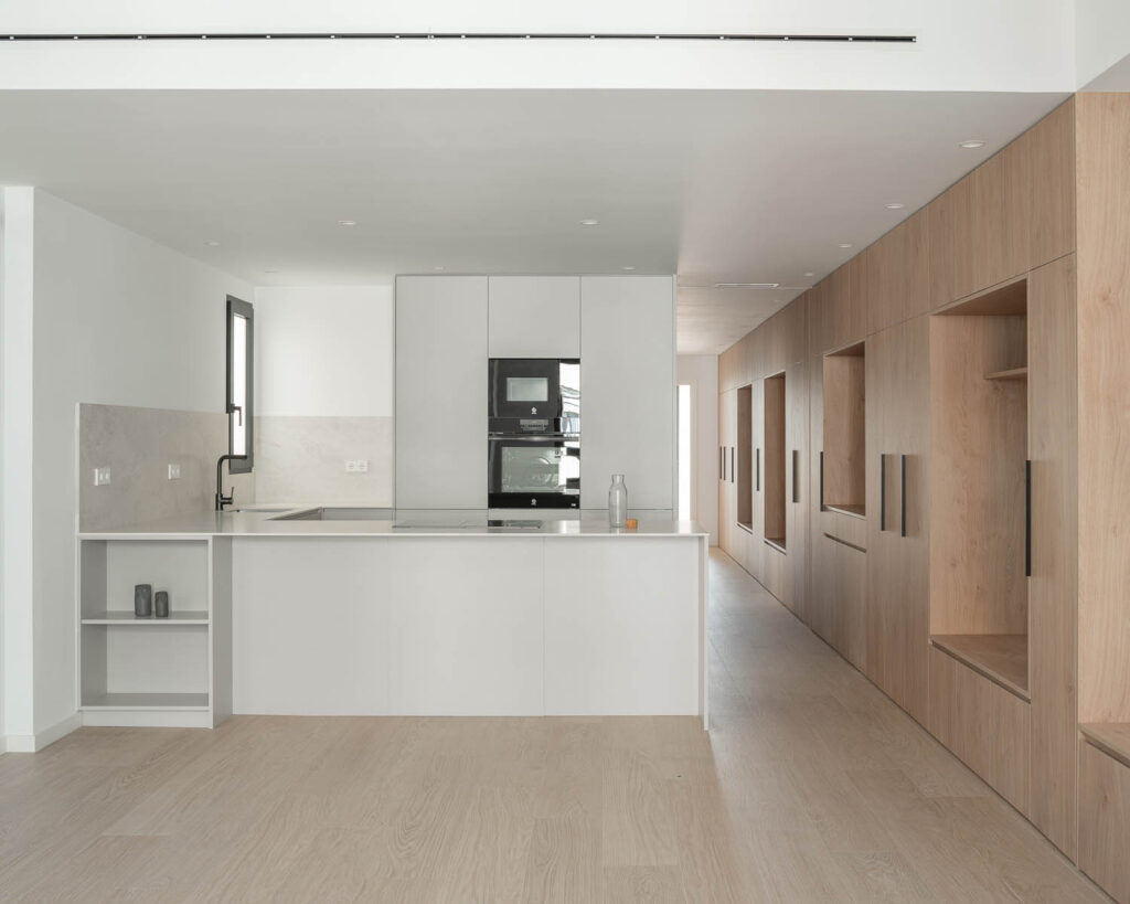 Respetando la ubicación de todas las estancias y el número de estas, se busca realizar intervenciones puntuales en la distribución; como abrir la cocina al comedor-salón acortanado el largo pasillo en el proceso y unificando el espacio de día, lo que proporcionará la luz natural en todas las estancias y una sensación de mucha más amplitud.