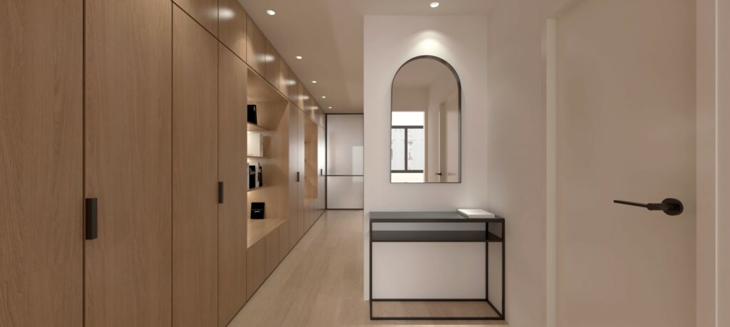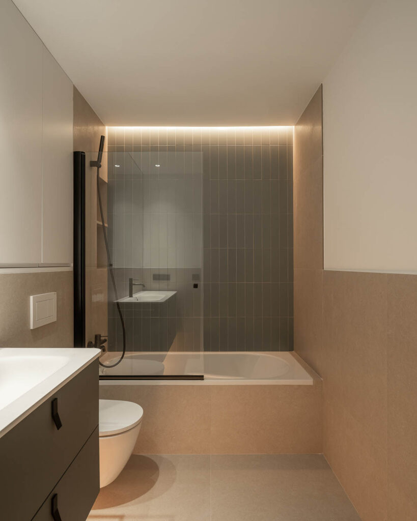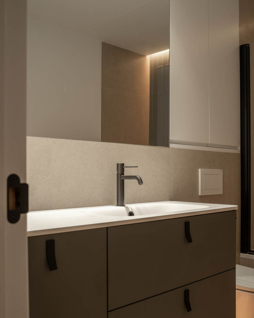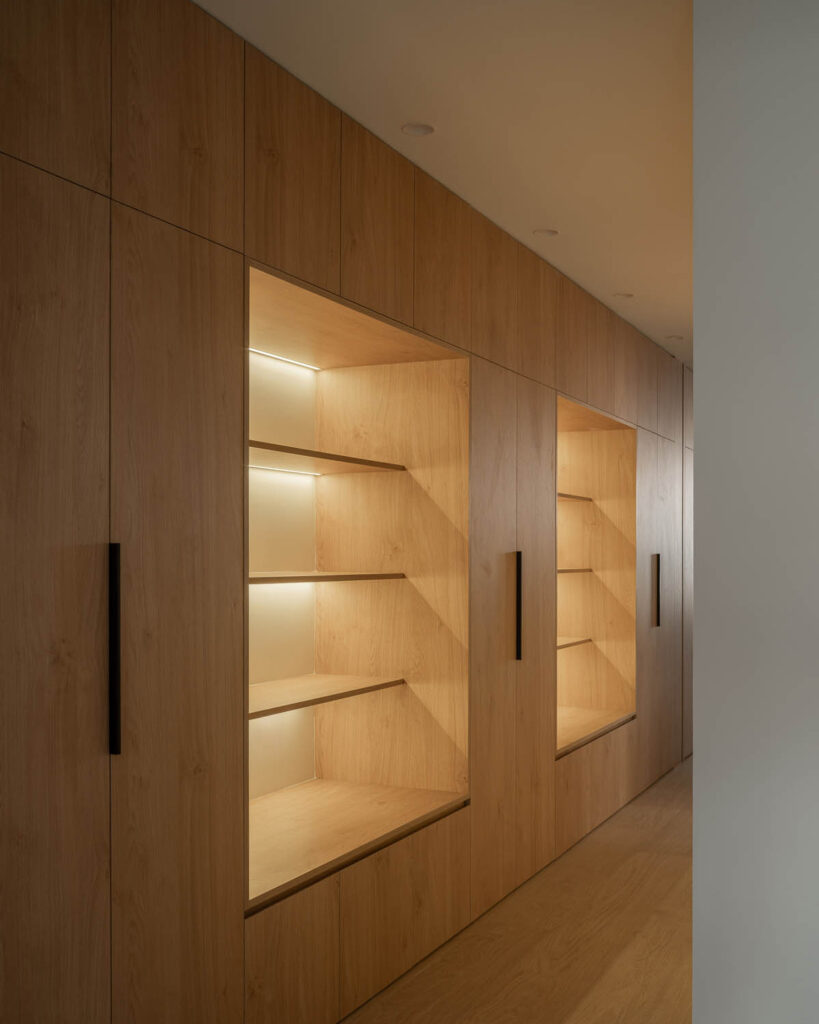 El estudio de la iluminación artificial ha servido para dotar de personalidad a estancias con menos carácter, como en el pasillo, donde genera un ritmo cálido en sus blancas paredes.