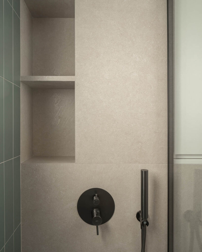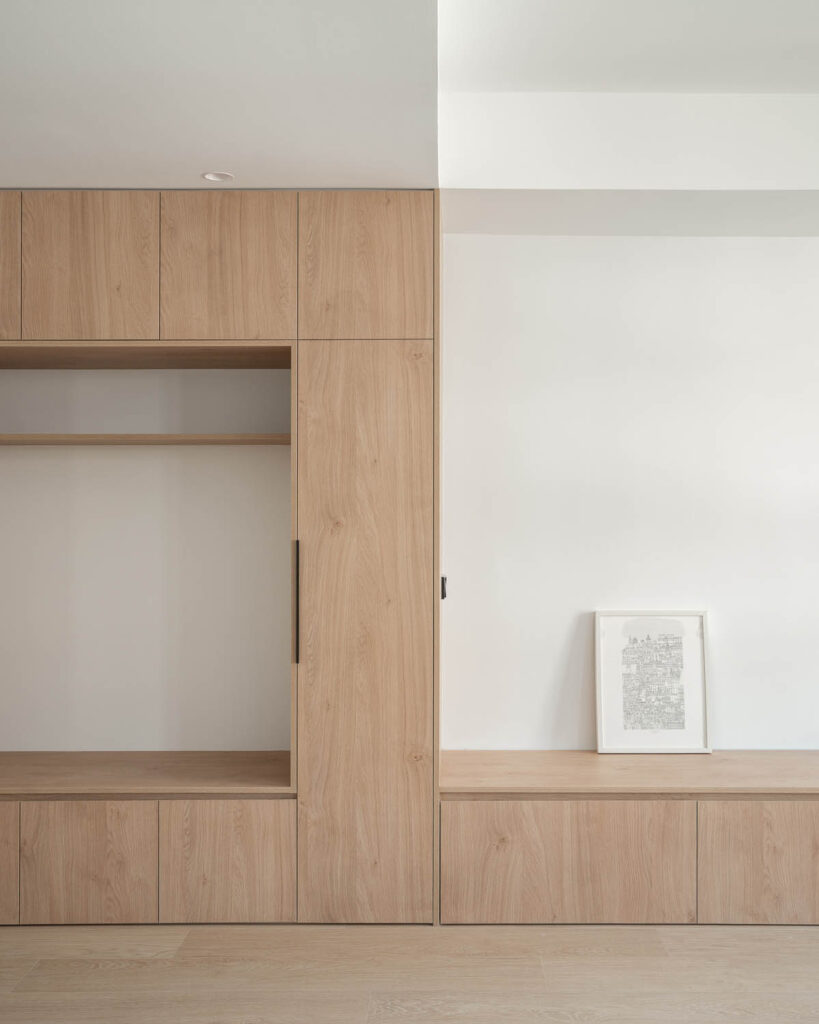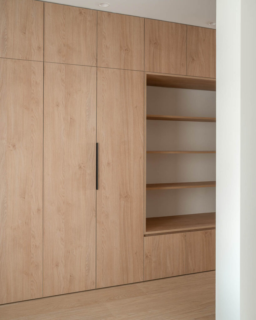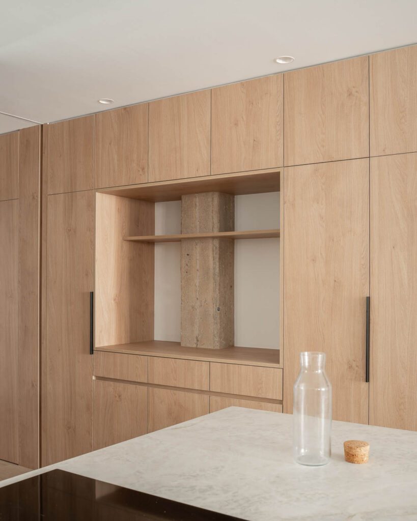 En la materialidad se ha optado por la madera como protagonista en el proyecto, generando esta misma la unión entre la cocina y el salón mediante un mueble a medida continuo. Así mismo se dejan algunos pilares y vigas de hormigón vistos que ofrecen contrapunto crudo a la paleta cálida de colores.