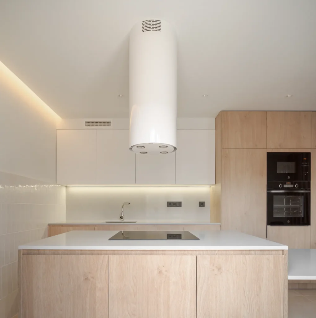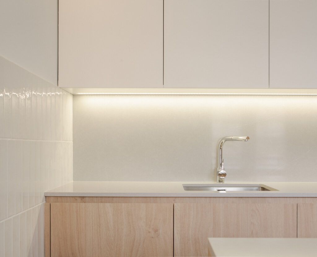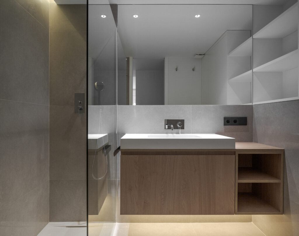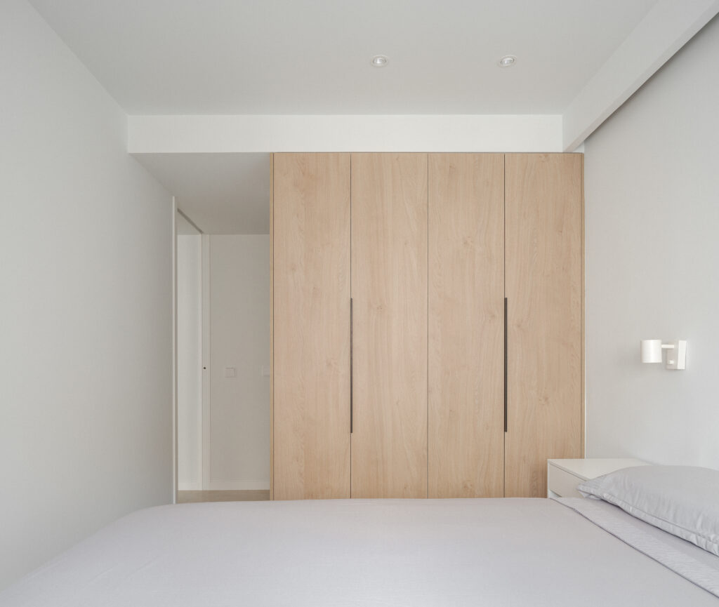 La madera y el porcelánico, de tonos cálidos y naturales, junto con la cuidada iluminación indirecta dotan a la vivienda de un aire de paz y tranquilidad, roto puntualmente por pequeños toques de materiales más industriales, como el hormigón de los pilares vistos y el metal lacado negro, creando un perfecto contraste.