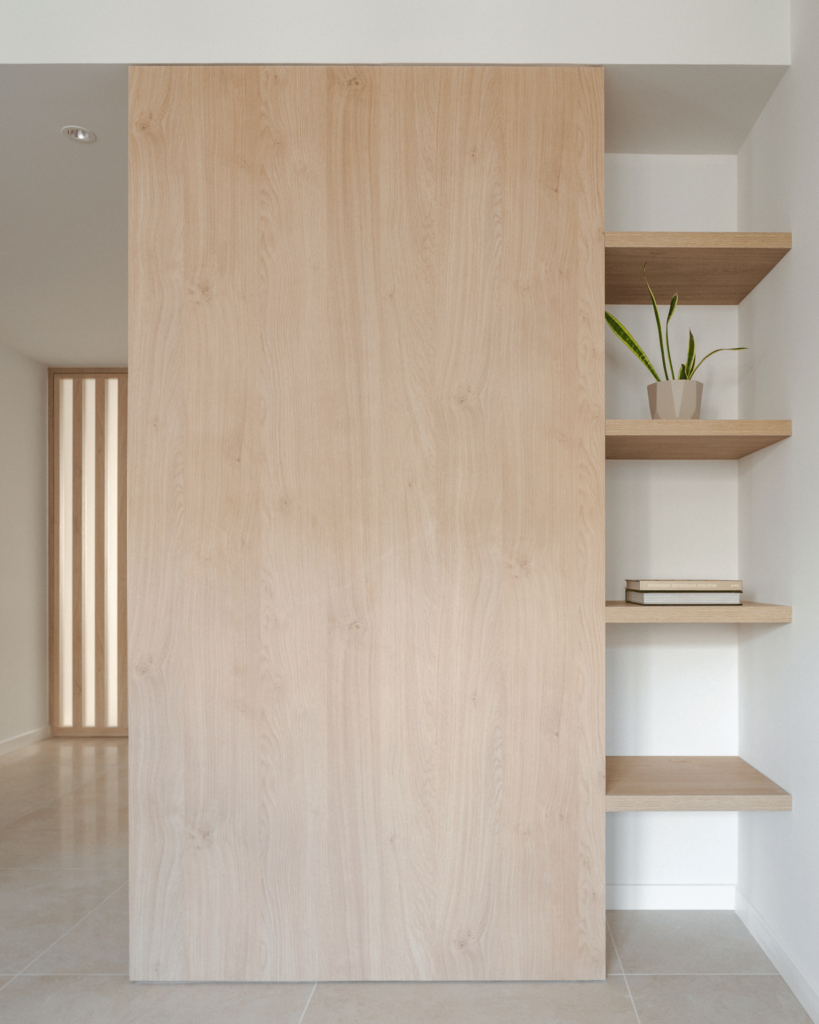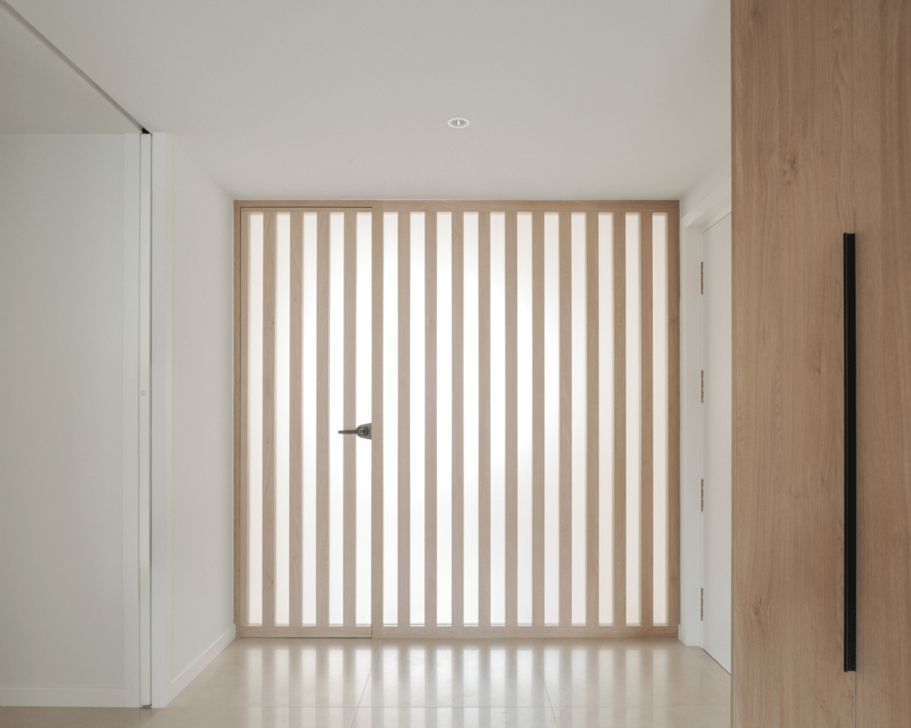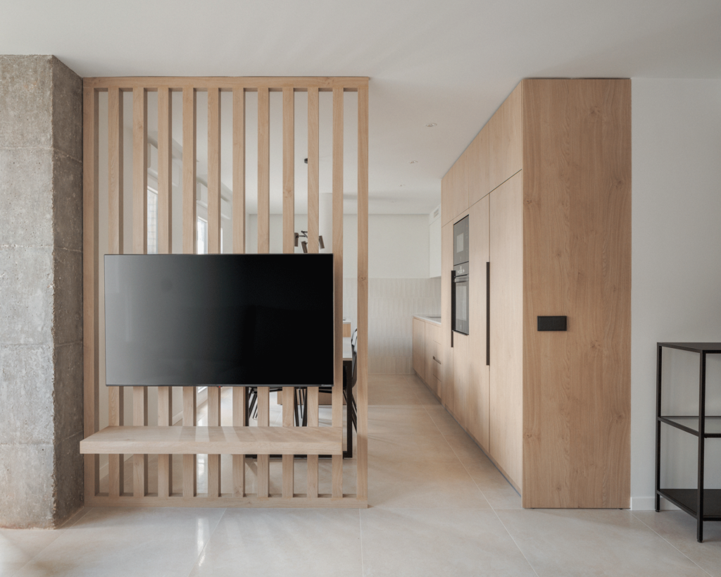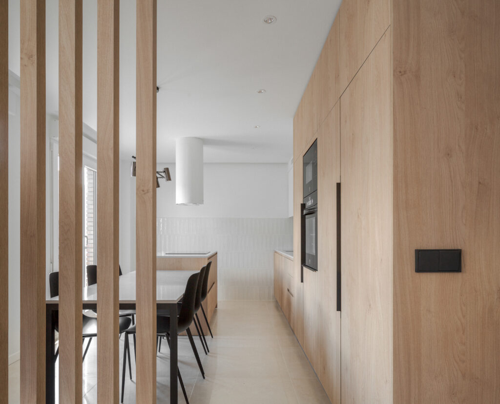 Esta zona de día se compartimenta con mobiliario a medida a través de cubos y celosías de madera que nos permiten acotar las estancias sin renunciar a la luz y a la continuidad visual de los espacios.