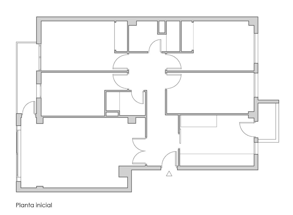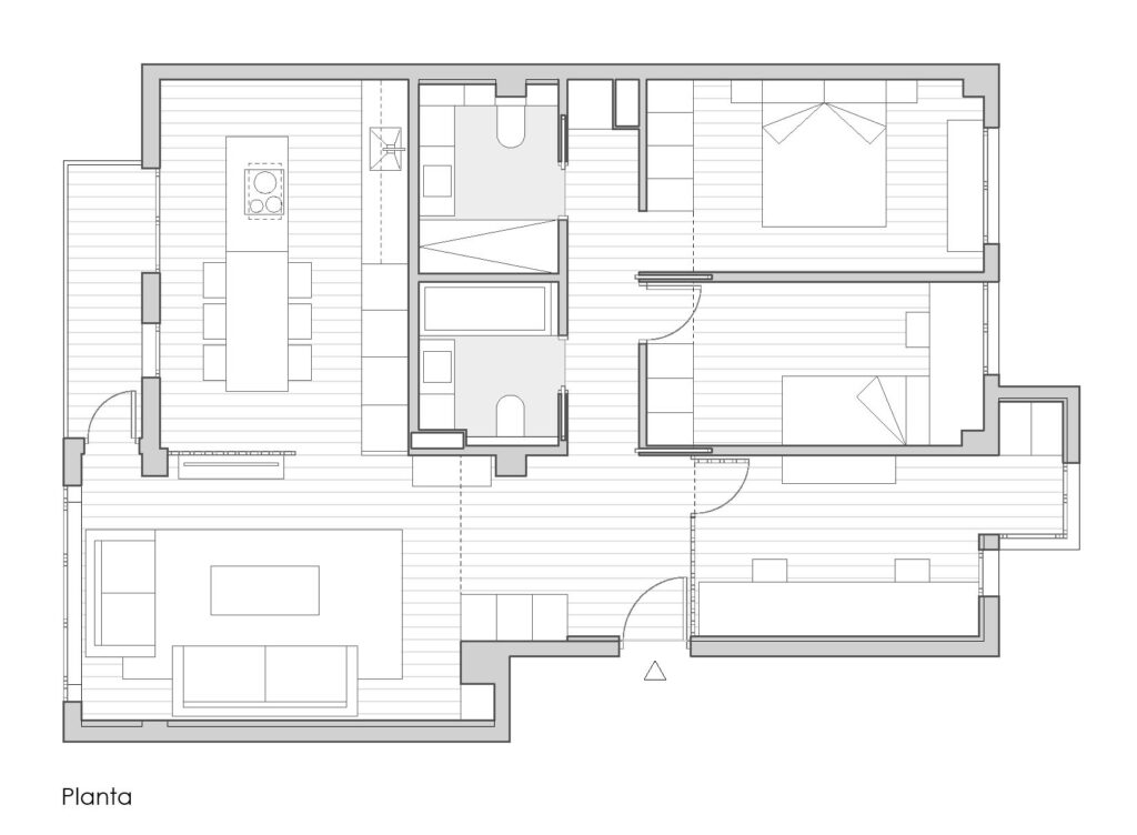 Se estudia un nueva distribución con el objetivo de que los espacios de día ganen amplitud e iluminación natural y dejar la zona de noche alejada de las miradas. Para ello se reubica la cocina a la fachada principal, uniendo así el salón, comedor, cocina y estudio en una única y amplia zona, y dejando los dormitorios y baños agrupados en la parte más profunda de la vivienda.